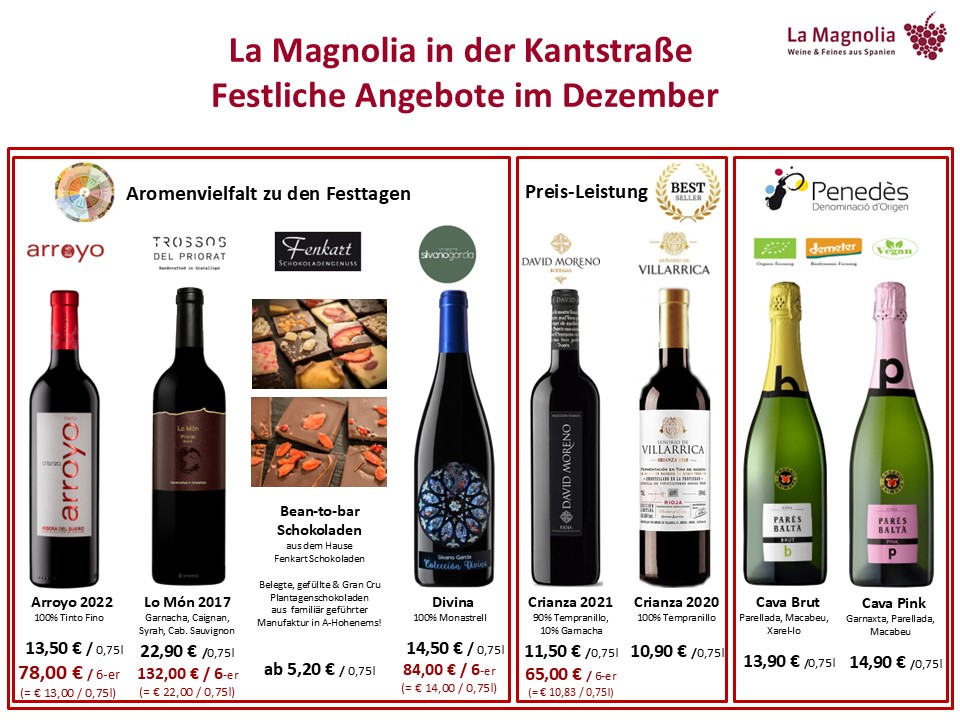 Alle Weine & Cava wie auch das gesamte Sortiment stehen in Königswinter-Oberdollendorf zur Verfügung. Das Angebot ist bis 20.12.2025 gültig und versteht sich ab Ladengeschäft LA MAGNOLIA in Königswinter-Oberdollendorf.